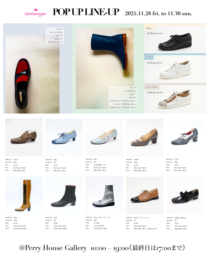 ラインナップは画像の通り、25AWの新作2点とtartaruga new basic sneakerに加えて、 tartarugaらしい個性豊かなブーツ、ローファー、レースアップシューズ10点をご用意いたします。また、ルームシューズ2種もオーダーいただけます。
