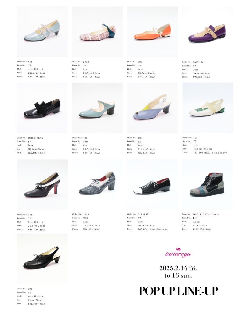 ラインナップは画像の通り、この他にルームシューズ・スニーカーもご用意いたします。