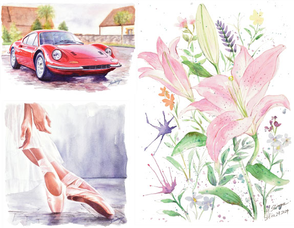会場では、今回展示する水彩画や過去に展示した水彩画